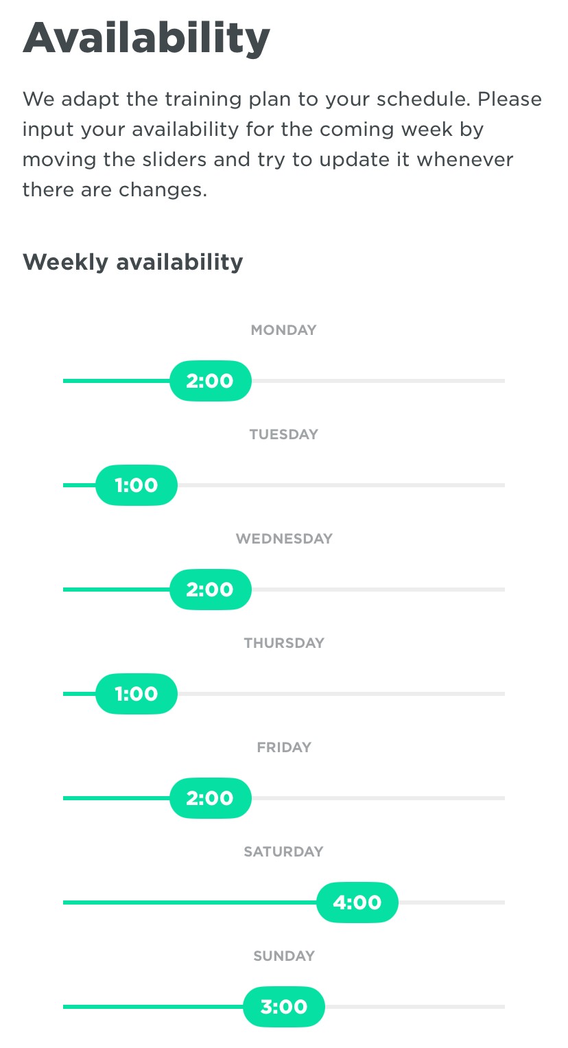 TrainerRoad’s adaptability is different compared to JOIN. In TrainerRoad the duration for the workouts in your schedule can be changed manually, but this is not based on your availability. So this involves quite some guesswork from your side. In JOIN, you set your weekly availability (see image below) and it will remove this guesswork and suggest you the best type of workout for your availability.