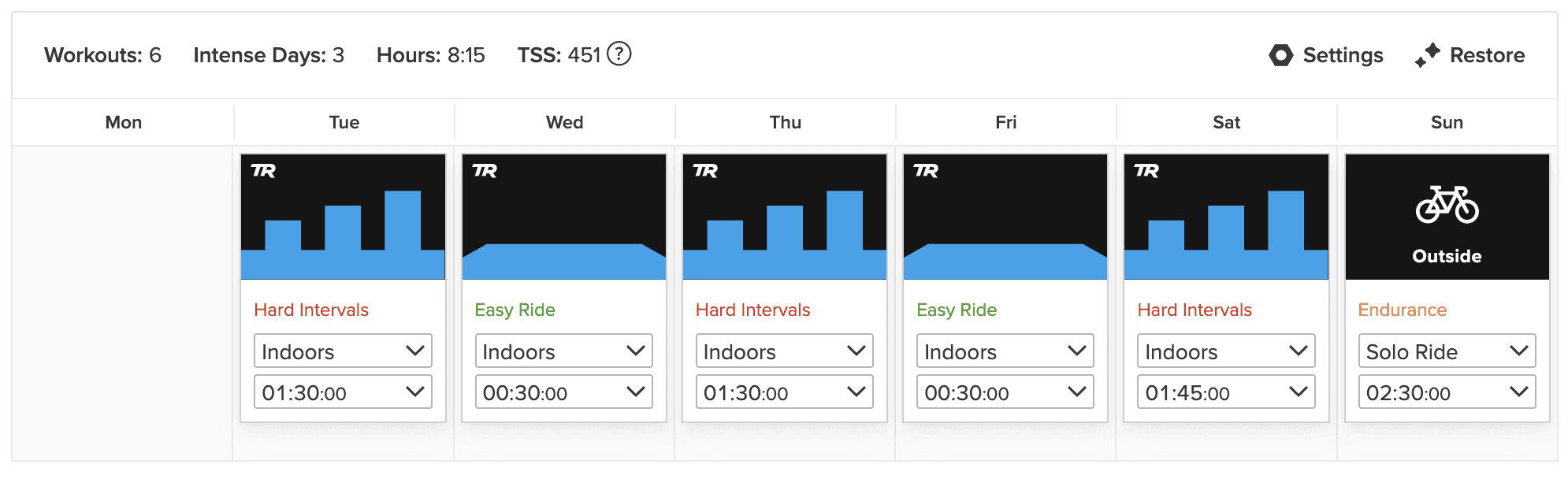Going with an Aggressive Training approach resulted in 6 workouts per week with 3 intense days a total of 8:15 hours average and TSS of 451. For what TrainerRoad calls an Aggressive Training approach, I was surprised with the low amount of hours. I normally average around 10-12 hours a week.