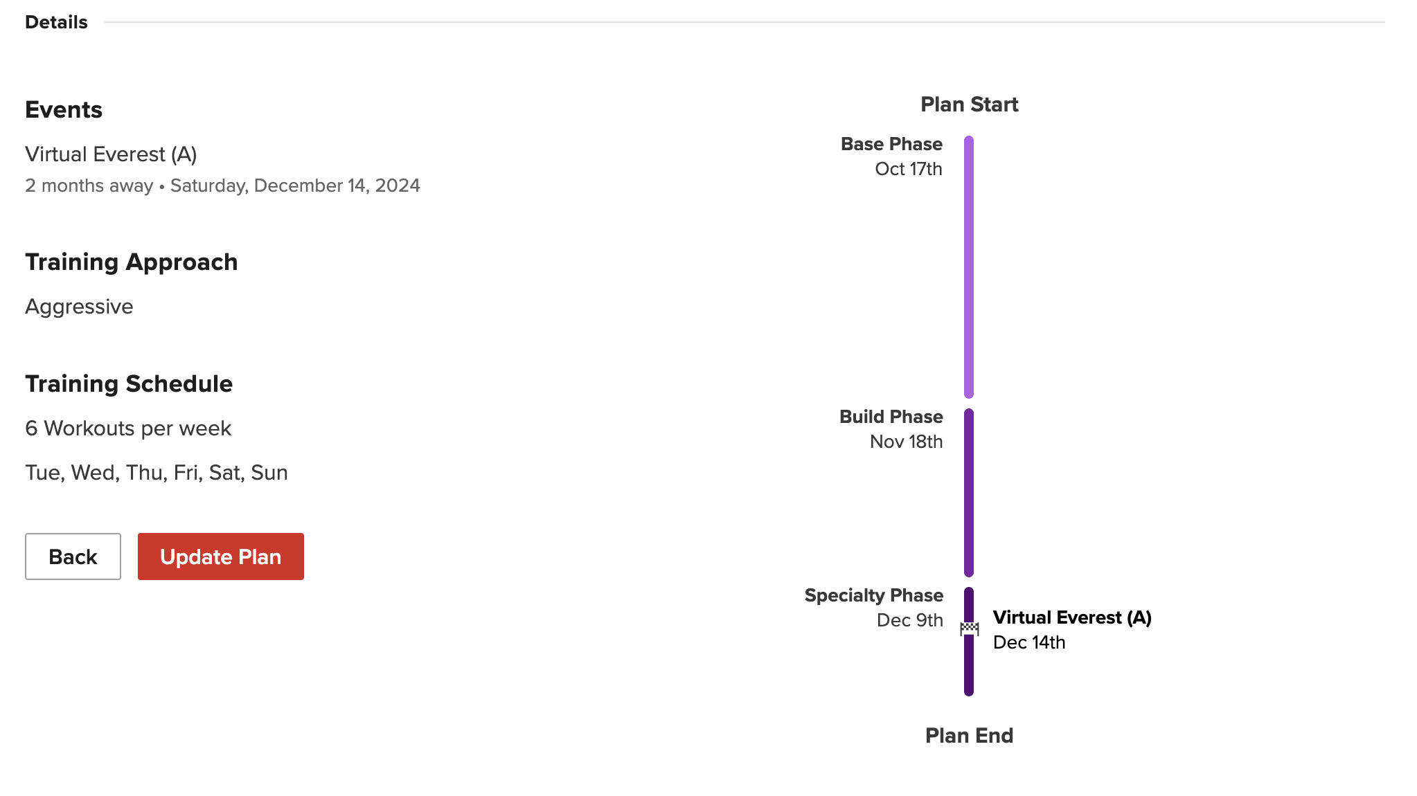 You are asked for a start date of the plan and any events you’re preparing for with priority and race type. You can choose your Training Approach, which controls the intensity and total workload of your plan.